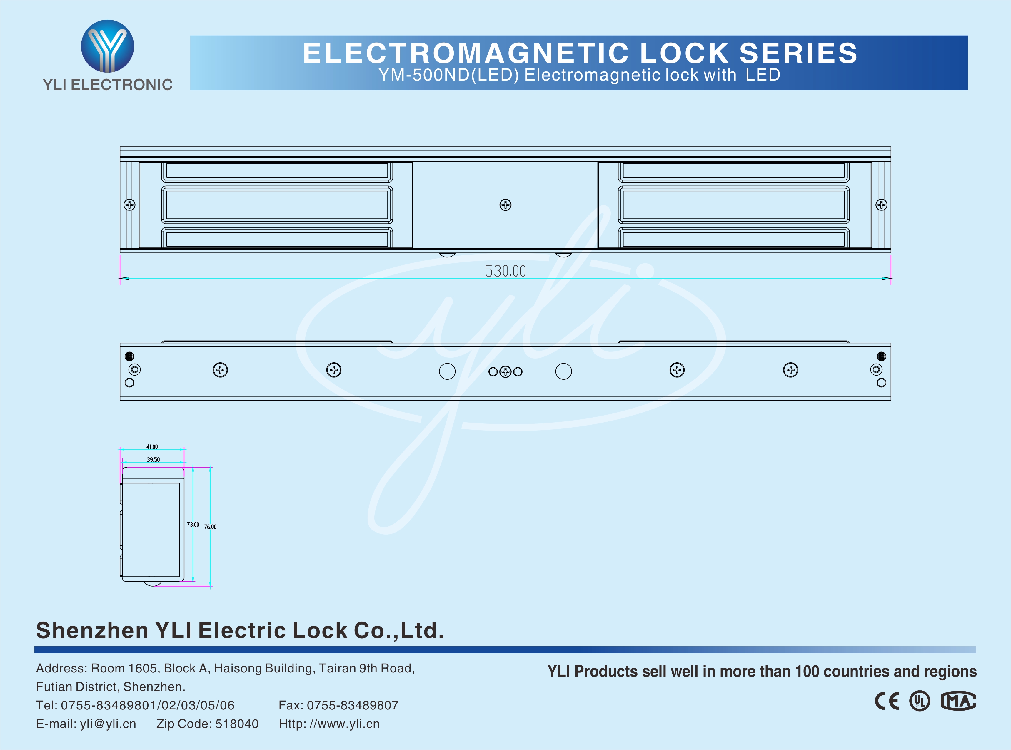 YM-500ND(LED) Double door magnetic lock is designed for wooden door, metal door, glass door and fireproof door. There is a set of lock status signal (NO/NC/COM) output contacts. The lock body is equipped with a large LED light . The green light indicates unlocking , and the red light indicates locking. YLl magnetic lock cores are produced with robotic laser welding technology, providing 2 to 3 times stronger impact resistance and torsional resistance than conventional production processes. The surface is treated with the internationally leading electroplating process and the lock itself has passed the 240-hour salt spray test in the national laboratory, achieving excellent performance of anti-oxidation, anti-rust and anti-corrosion. Our company offers a complete range of brackets for different locks.