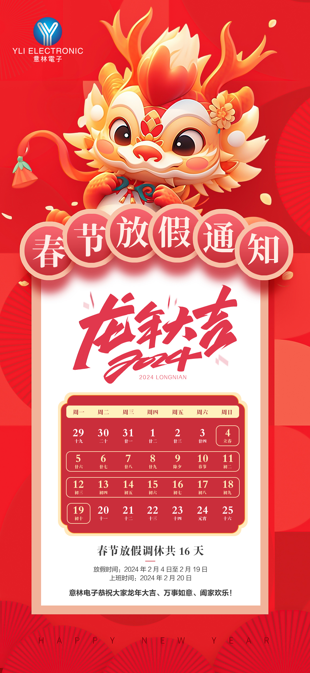 關于意林電子2024年“春節”放假安排通知